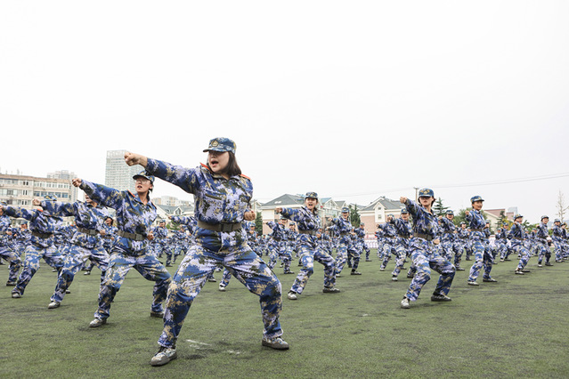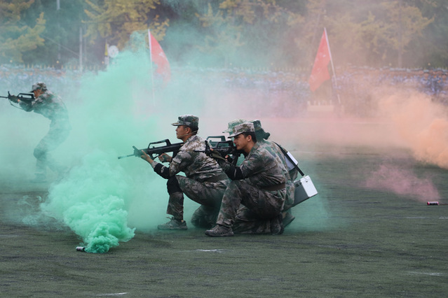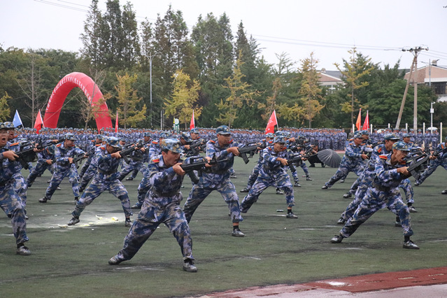 随后登场的新生表演方阵同样气势如虹。刺杀操表演中,新生手持模拟枪,呐喊声震天,“杀”声连绵,突刺、防刺、反击整齐有力,锋芒毕露;军体拳表演时,出拳如风、踢腿如电,动作刚柔并济,朝气蓬勃;格斗术演练招式凌厉、配合默契,目光炯炯,虽略带青涩却写满坚毅,展现出军训淬炼出的飒爽英姿与不屈风骨。