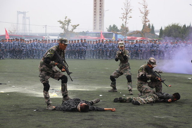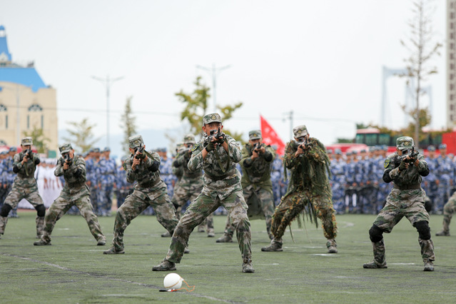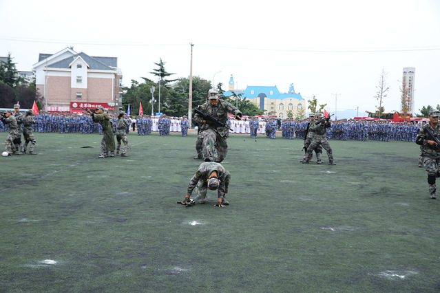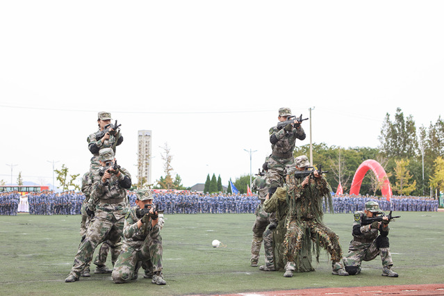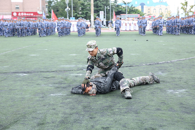 率先出场的是军训教官方阵。他们身姿挺拔、眼神锐利,在指令声中迅速展开演示。倒功变换时,如利剑般俯冲落地,动作刚劲利落;战术演练中,低姿匍匐、快速跃进,动作精准规范,展现出过硬的军事素养;模拟战术环节,格挡、锁喉、别臂等一系列招式紧密衔接,尽显军人的果敢与迅猛。