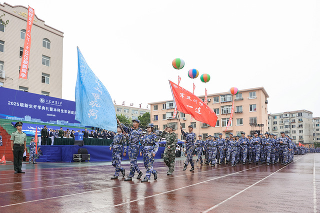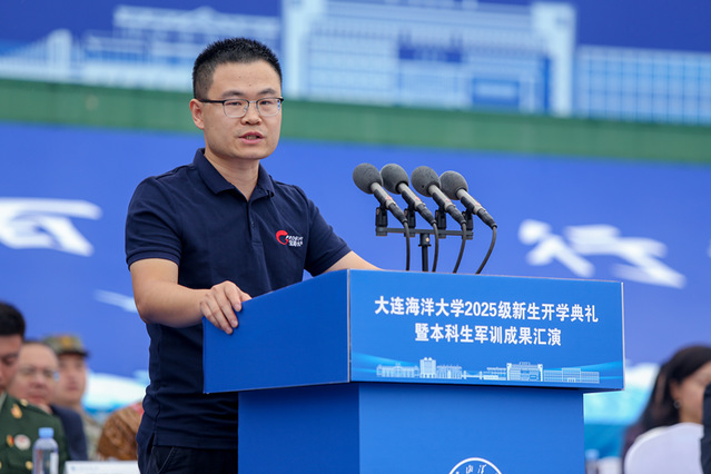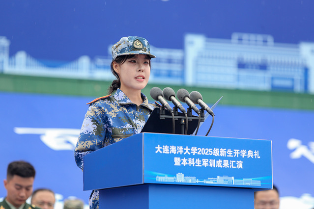 新生代表、海洋法律与人文学院2025级本科生姚雨岑向全体新生发出倡议:以海为志,将个人理想融入国家海洋强国战略;以学为舟,在广阔知识中开阔眼界、破解难题;以德为舵,践行“海纳百川、行稳致远”的校训,锤炼高尚品格。她呼吁大家将军训淬炼的坚强意志延续到今后的学习生活中,在“大海大”这片热土上书写无愧于时代的青春篇章。