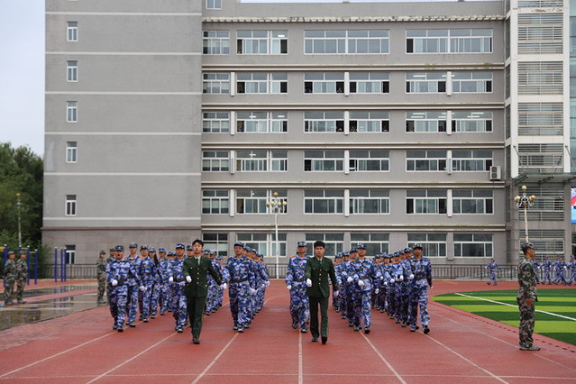 典礼现场,激昂的军乐响起,由40名军训教官与370名新生代表组成的表演方队迈着坚定有力的步伐先后登场,顷刻点燃全场气氛。